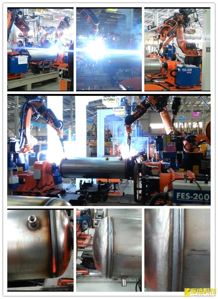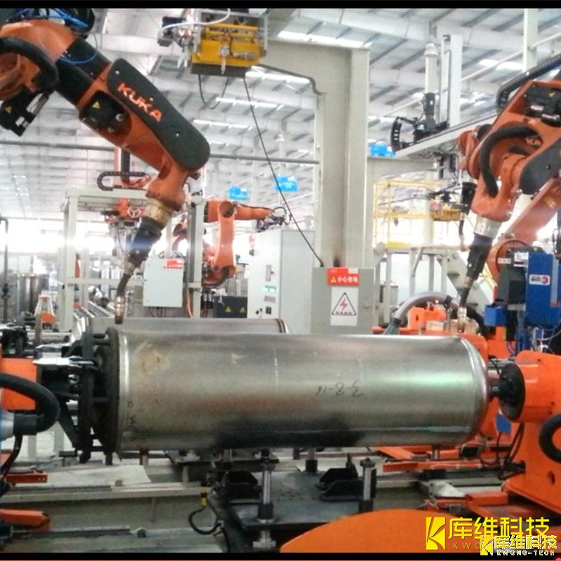 庫(kù)維科技于2015年與某企業(yè)合作建設(shè)智能壓力容器(熱水器內(nèi)膽)自動(dòng)化焊接生產(chǎn)線項(xiàng)目,成功實(shí)現(xiàn)經(jīng)濟(jì)效益和產(chǎn)能效益雙提升。壓力容器智能機(jī)器人柔性自動(dòng)化生產(chǎn)線是由柔性機(jī)器人工作站及輸送線體組成的一站式柔性自動(dòng)化生產(chǎn)線。生產(chǎn)線通過(guò)集成視覺(jué)檢測(cè)及對(duì)位、自動(dòng)焊接、自動(dòng)搬運(yùn)及其它各種輔材等功能來(lái)實(shí)現(xiàn)壓力容器的自動(dòng)生產(chǎn)。